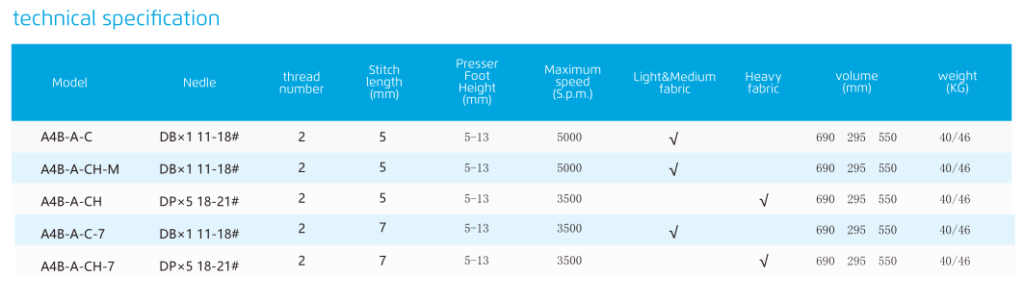 - High-Speed Stitching: Capable of sewing up to 5,000 stitches per minute, the A4B dramatically improves productivity, making it suitable for high-volume garment production.